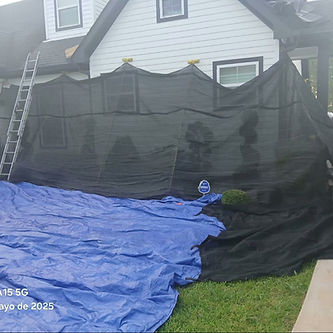Landscaping , plants, windows, and exterior walls are protected with tarps and coverings.